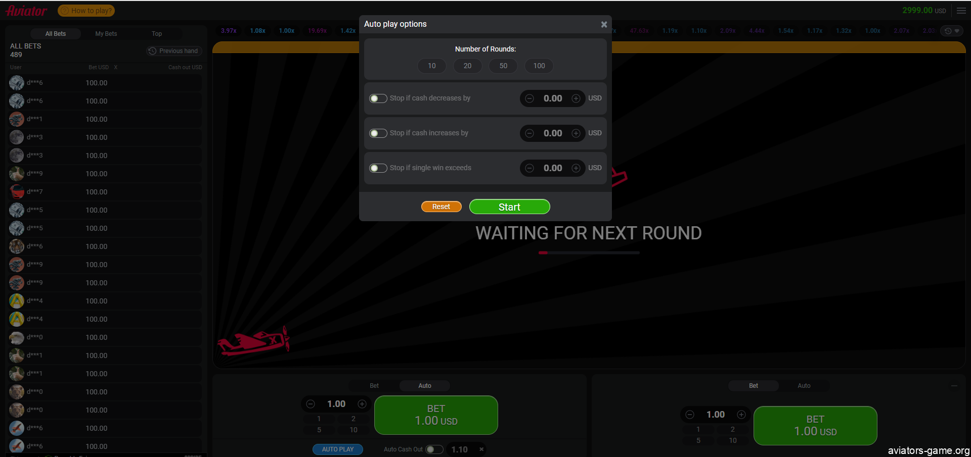 When you want a break from playing or just have an important business to take care of, you can set the Aviator India game to play automatically in the background. To enable the auto-play feature, switch from Bet to Auto in the bottom menu. You may play up to 100 rounds this way – just set the bet size. The main options for auto-cashout include:
